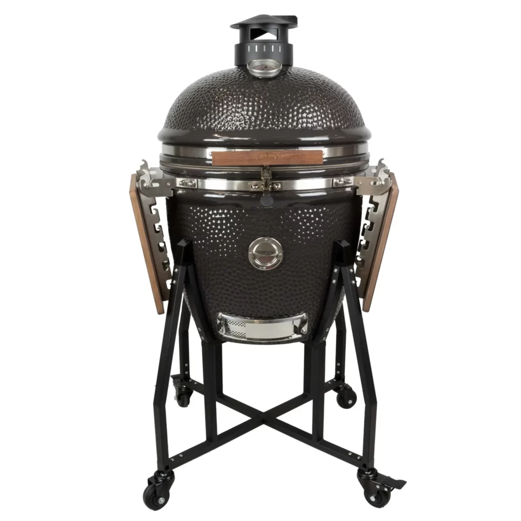 De 21 inch Grizzly Grills Elite kamado is echt een kwalitatief hoogwaardige topper. De Grizzly Grills way is avontuurlijk genieten! De componenten zijn allemaal zo duurzaam mogelijk gemaakt om een zo klein mogelijk impact op het milieu te hebben, de natuur is ons namelijk lief. Hierdoor is de levensduur ook gewoon beregoed..! Deze Kamado met een grillrooster van 46 cm geeft je meer dan voldoende ruimte om allerlei heerlijkheden perfect te bereiden. Ideaal voor 4-8 personen. Kamado’s zijn ontworpen voor langdurige barbecue sessies. Door de vorm van de kamado en het hoogwaardige keramiek kan deze barbecue erg lang en stabiel branden, ideaal dus voor de zogenaamde low & slow gerechten! In de Grizzly Grills kamado is gebruik gemaakt van het dikwandige cordieriet keramiek. De schuif aan de onderkant en de margrietschijf aan de bovenkant geven je eenvoudig de mogelijkheid om temperaturen eenvoudig te reguleren en veranderen indien gewenst. De slotsluiting in op de opening zorgt dat je Grizzly kamado altijd goed sluit en dat je geen valse lucht trekt of warmte verliest. De 21 inch Girzzly is voorzien van een kwalitatief stevig zwart onderstel met goede wieltjes, waarvan 2 met rem om hem vast te zetten. De plankjes aan de zijkant geven je veel werkruimte tijdens het barbecueën en zijn weg te klappen wanneer je deze niet nodig hebt. Aan de onderkant van deze zijplankjes zijn meerdere haakjes gemonteerd waaraan je je gereedschap kunt ophangen. Het onderstel en het scharniermechanisme zijn van hoogwaadig gepoedercoat staal gemaakt en de vering zorgt dat de koepel eenvoudig te openen is maar daarnaast ook erg goed afsluit, mede door de slotsluiting en de glasvezel afdichting. Via de rookhout invoer aan de voorkant van de kamado kan je eenvoudig rookhout toevoegen in de Kamado zonder de koepel te hoeven openen én er dus vrijwel geen warmte verloren gaat tijdens het barbecueën en kun je deze direct in het midden van de vuurschaal plaatsen. In het midden van de vuurschaal bevindt zich tevens de kolenmand, die ervoor zorgt dat de luchtstroom goed verdeeld over de kolen gaat, wat voor een betere stabiliteit van temperatuur zorgt. De 21 inch Kamado is een zeer gangbaar formaat, waardoor je er veel accessoires voor kunt vinden om het beste uit je gerechten te halen.